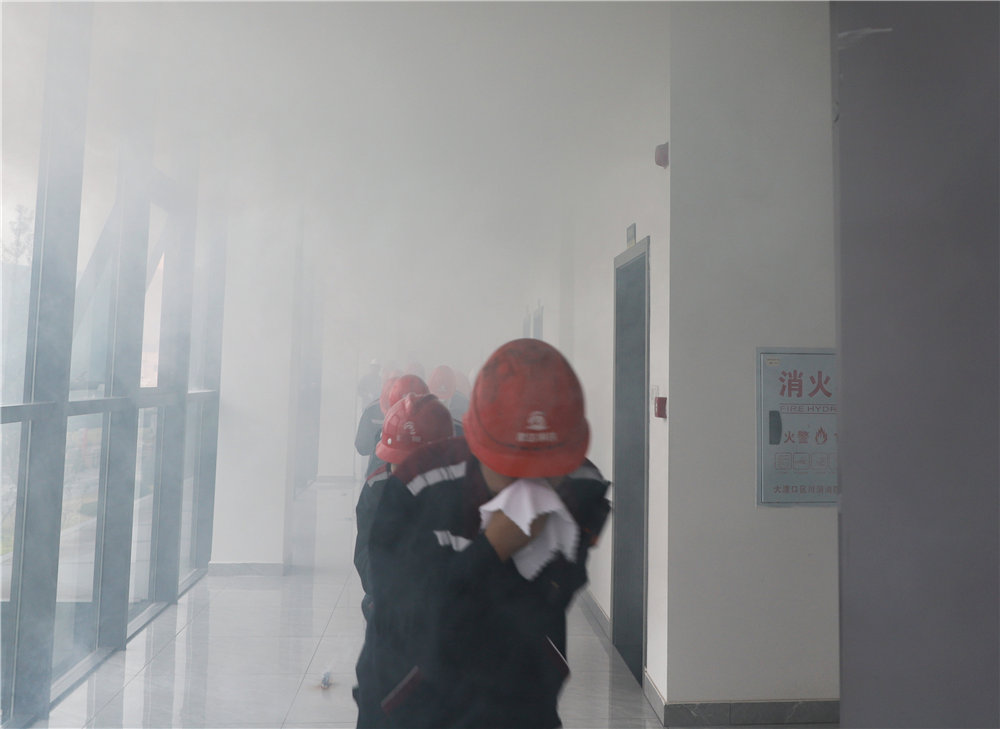 此次演练模拟废钢部办公楼办公用品着火,警报拉响后,现场烟雾弥漫。各楼层人员迅速反应,有序地朝着楼梯间紧急疏散。疏散过程中,他们捂住口鼻、弯腰前行,快速撤离至安全区域。
