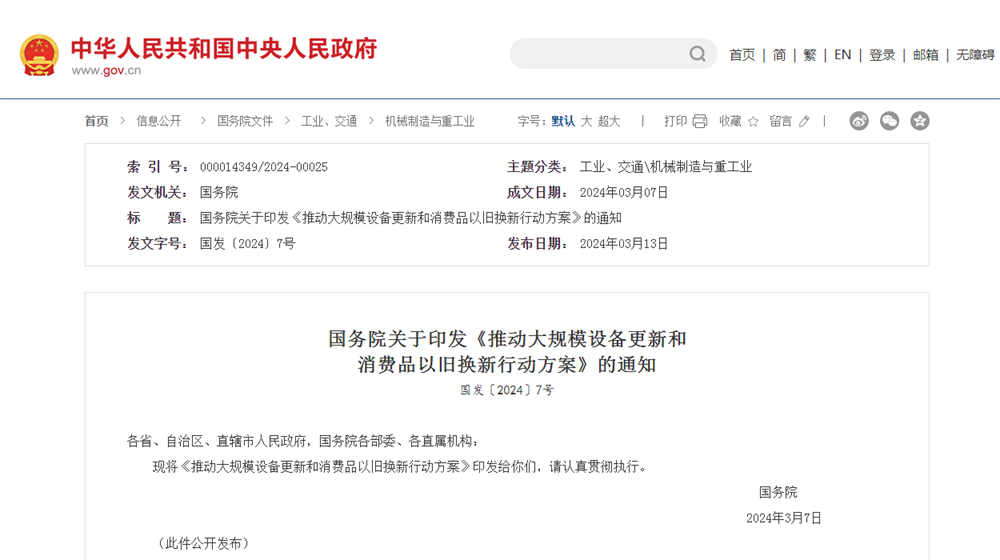 国务院关于印发《推动大规模设备更新和消费品以旧换新行动方案》的通知国发〔2024〕7号各省、自治区、直辖市人民政府,国务院各部委、各直属机构:现将《推动大规模设...